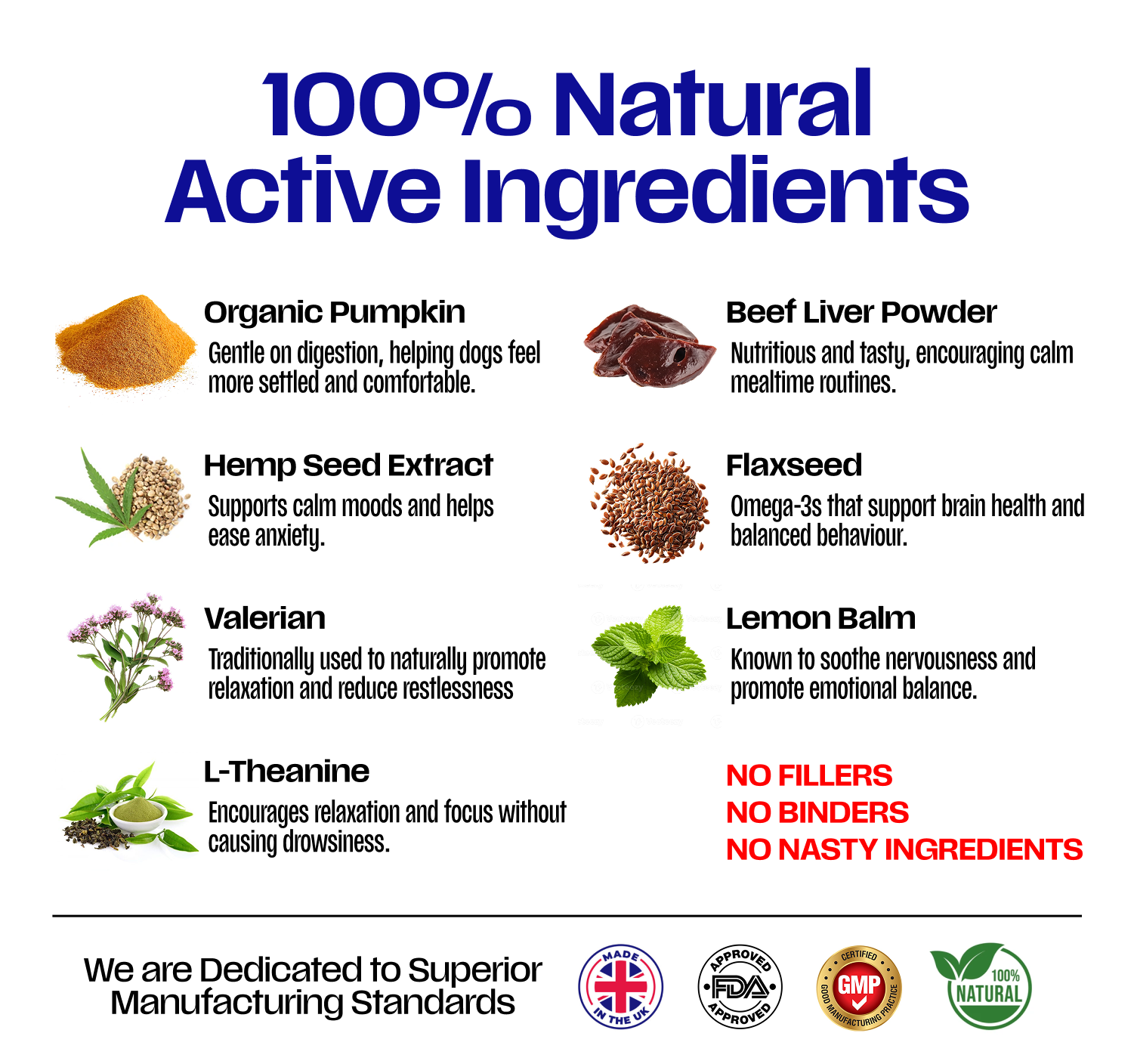 L-theanine is a natural amino acid which can not only improve a dogs mood it has been scientifically proven to help dogs with 'Storm sensitivity'