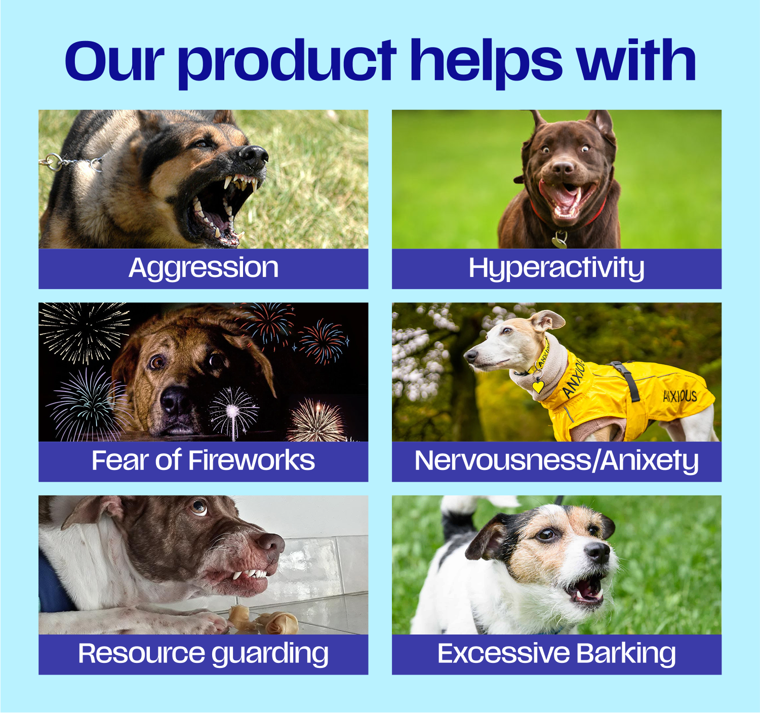 Many dogs are afraid of Fireworks, thunderstorms and loud noises, a study performed on dogs sensitive to loud noises where given L-theanine, where found to pace less, bark less, and hide less, L-theanine was studied to be 78% more effective in helping dogs feel less anxious around loud noises